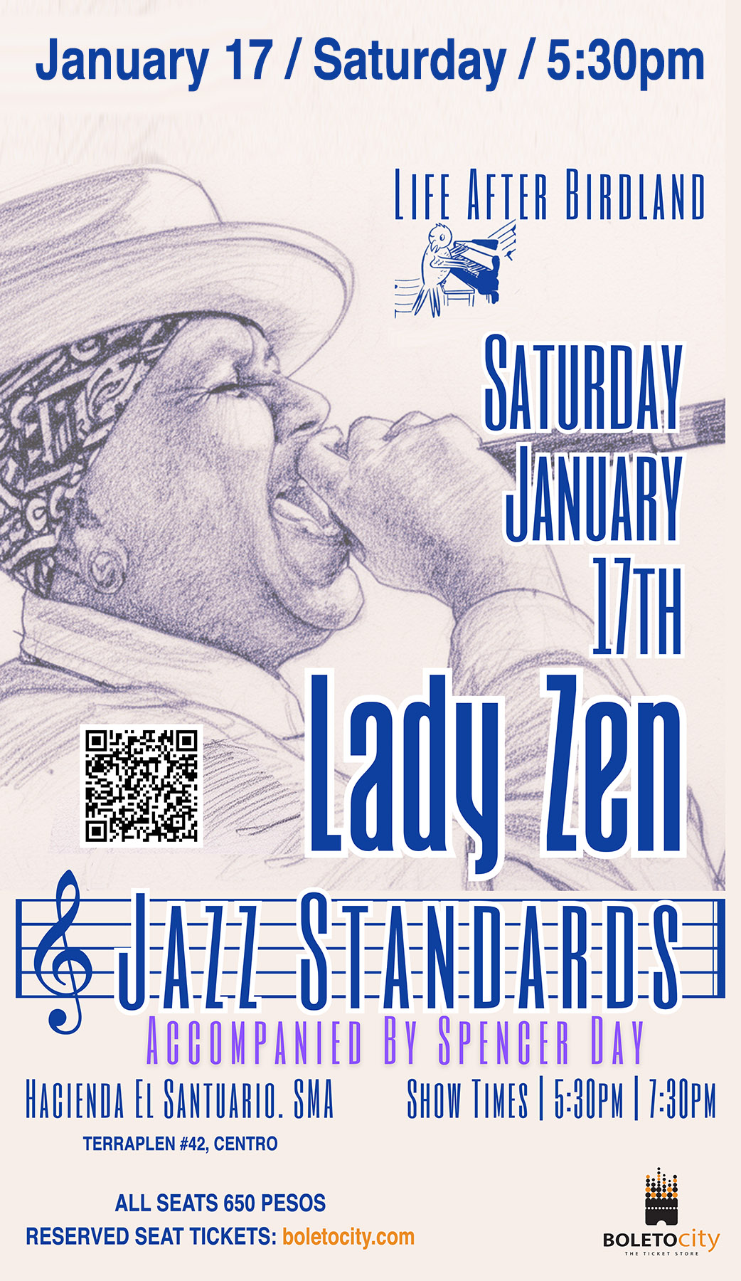 There will be two shows, at 5:30pm and 7:30pm, on Saturday, January 17, 2026. The venue is Hacienda El Santuario, a luxury boutique hotel in Centro, at Terraplen 42 — an elegant setting where you can relax with a cocktail and enjoy the artistry of Lady Zen & Spencer Day, two longtime friends performing for the first time as a duo.