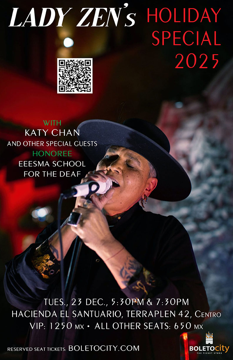 Never fear. Lady Zen’s Holiday Special 2025 is scheduled for two shows on Tuesday, December 23, at Hacienda El Santuario, a luxury boutique hotel in Centro, at Terraplen 42. Zen will be performing with a band, and with special guests—among them, Chilean-born singer Katy Chan, a dynamic artist who has been a member of more than twenty musical groups in Chile and Argentina; and virtuoso guitarist and recording artist Román Sebastián. The concert’s honoree, EEESMA School for the Deaf, will have on hand its remarkable sign-language children’s choir.