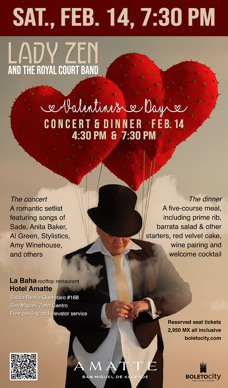 The vocal sensation Lady Zen has lately been commuting between San Miguel, the city Zen calls home, and New York City, where the blues singer with an opera-trained voice recently performed at Lincoln Center and Birdland. Every Valentine’s Day, Zen has a tradition of putting on a spectacular show of romantic songs, backed by Mexico City’s topflight Royal Court Band.